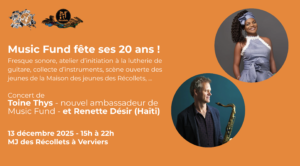 Le premier événement festif sera une soirée organisée dans la Maison de jeunes des Récollets le 13 décembre prochain à Verviers. Cette soirée a pour vocation d’officialiser les collectes d’instruments au sein de celle-ci, ainsi que la nomination du saxophoniste Toine Thys comme ambassadeur de Music Fund.